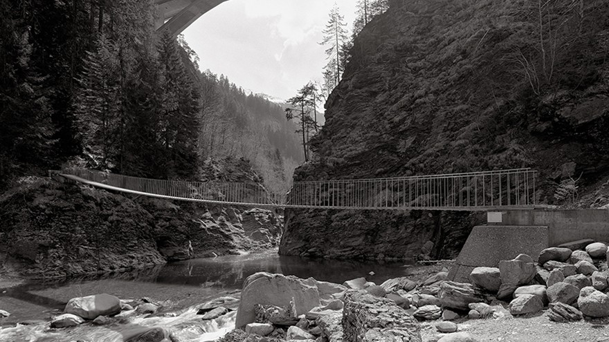 La pratica di ricorrere a materiali locali e a tecniche costruttive artigianali e tradizionali è presente anche nella „Dorfbrücke” di Vals, una vera e propria estensione della piazza del paese, realizzata in lastre di Gneis del vallese e cemento armato sapientemente utilizzati nella loro funzione, assieme portante ed estetica. Progettata da Jürg Conzett con la consulenza di Peter Zumthor, La „Dorfbrücke” introduce uno degli argomenti centrali della mostra, e cioè come l’opera ingegneristica possa trarre ispirazione nel costante confronto con la propria tradizione disciplinare, progettuale e costruttiva, in relazione col paesaggio che la ospita.
